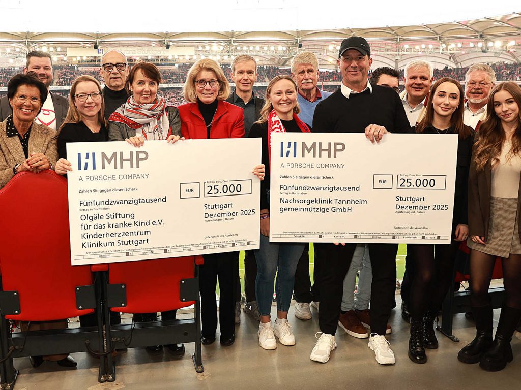 Gemeinsam mit Dr. Stefanie Schuster von der Olgäle-Stiftung, Prof. Dr. Gunter Kerst, Ärztlicher Direktor der Pädiatrie 3 – Zentrum für Angeborene Herzfehler Stuttgart, Pädiatrische Intensivmedizin, Pneumologie und Allergologie im Olgahospital und Prof. Dr. Uhlemann, ehem. Ärztlicher Direktor der Pädiatrie 3, fand auch wieder die traditionelle Scheckübergabe im Olgäle statt – eine weitere in der MHP-Arena folgte kurz darauf.