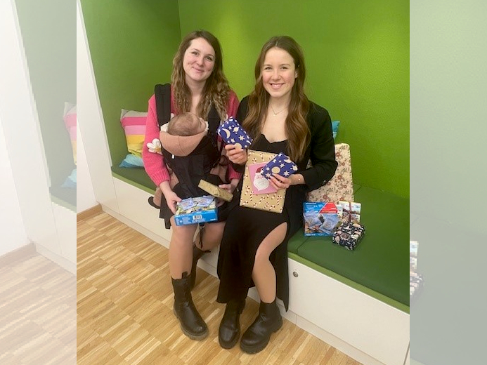 Valentine Gässler, Gründerin von Zaubermomente und ihre Schwester Bernadette Jung übergaben die liebevoll verpackten Trösterchen, wie z. B. Pixibücher, persönlich beim Besuch im Olgäle.